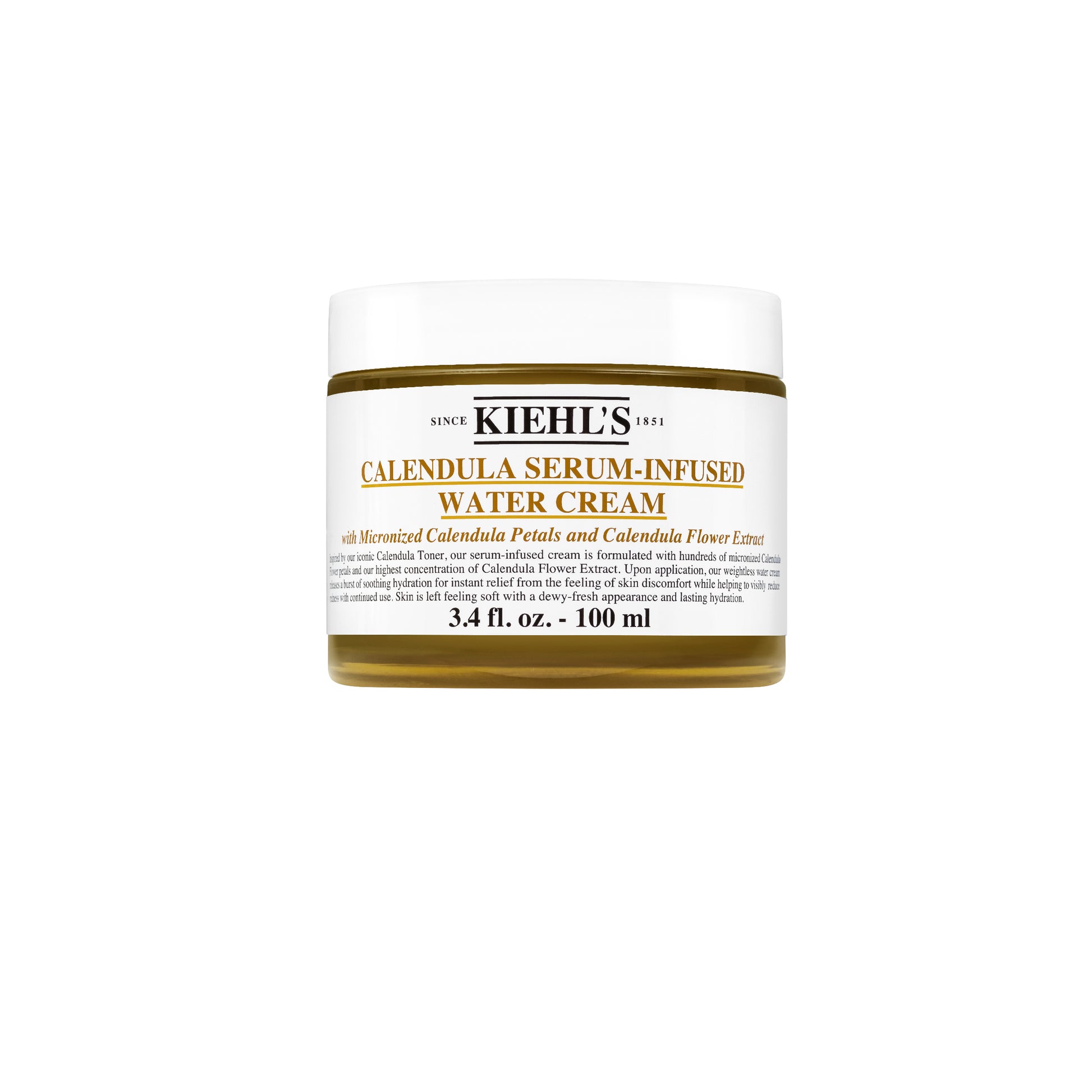 Kiehl's Calendula Serum-Infused Water Cream is a lightweight, dual-phase moisturizer that combines the benefits of a serum and a cream. Infused with concentrated Calendula Serum, Calendula Flower Extract, and micronized Calendula petals, this water cream delivers a burst of hydration upon application. The formula transforms into a refreshing, watery texture that soothes and revitalizes the skin, leaving it with a dewy, radiant appearance.